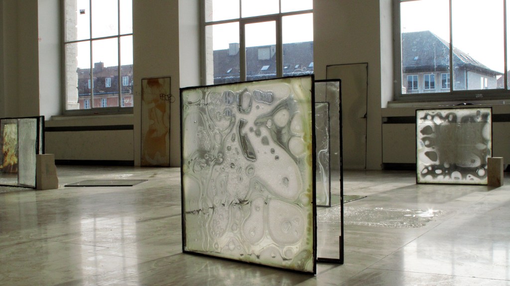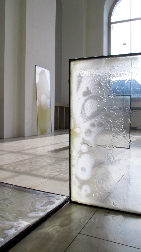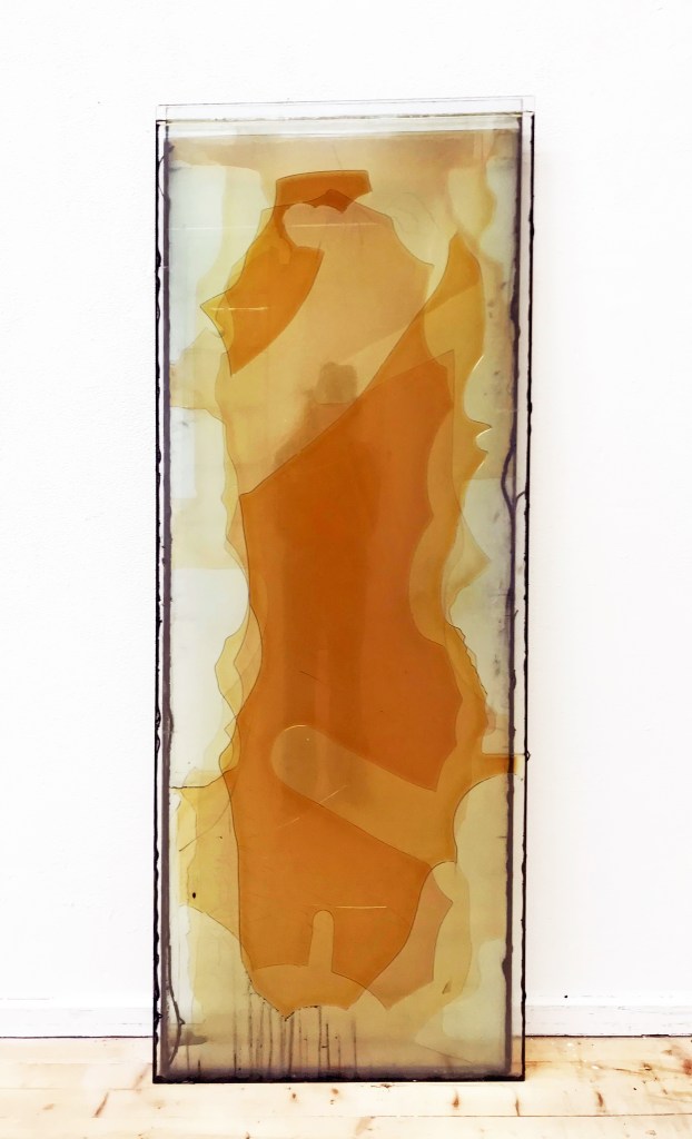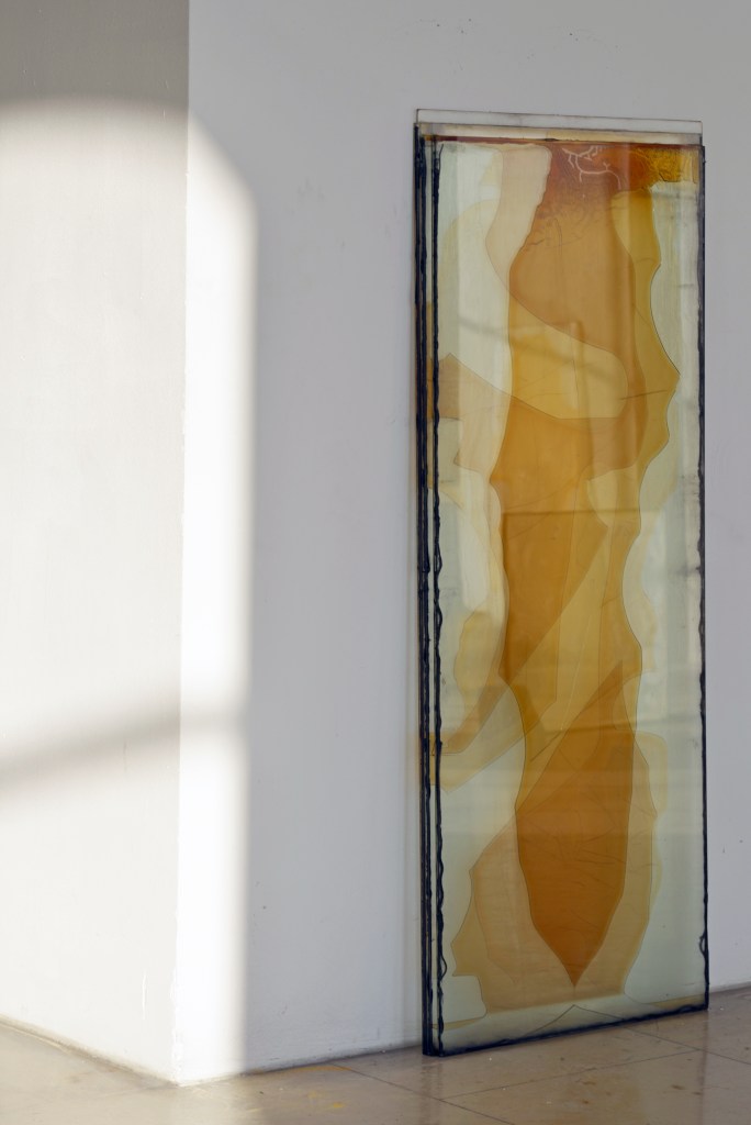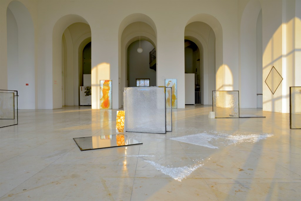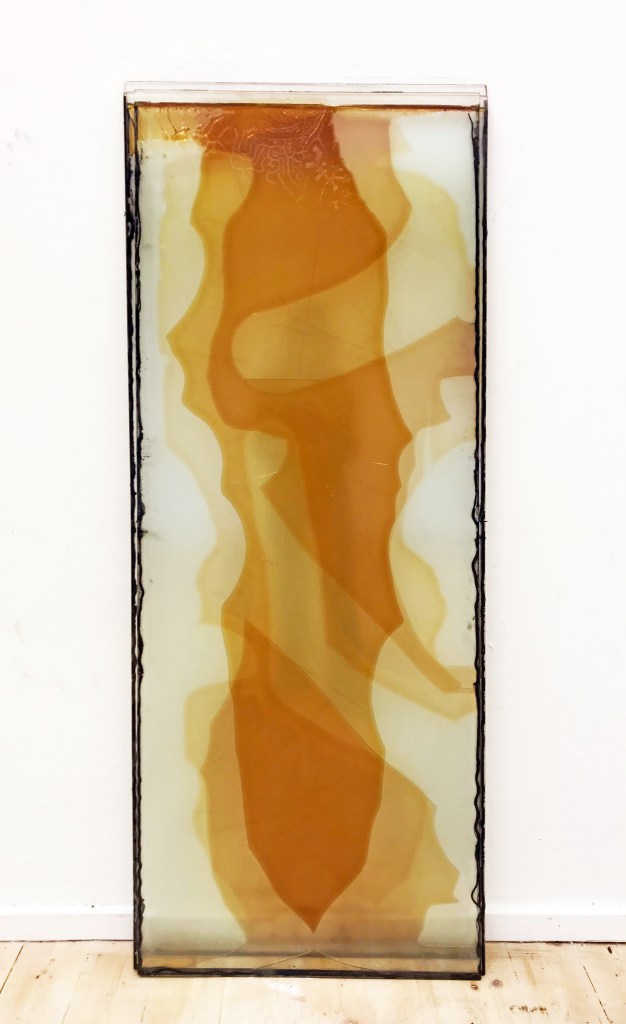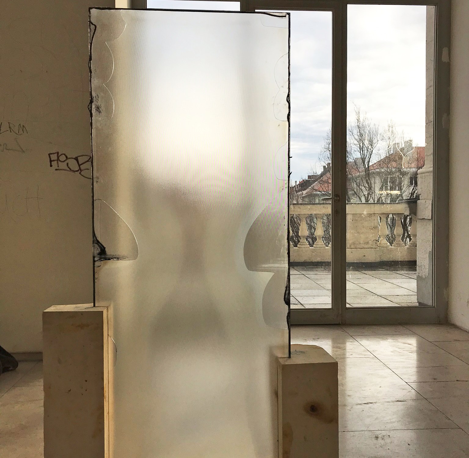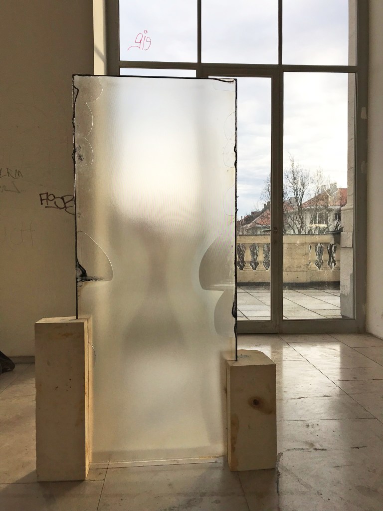 “In the AdBK’s Vestibule, Arcadias presented a workshop situation. In her current work process, Garance Arcadias amplified the pictorial character of the windows still further by heating them and illuminating them. She presented the processual-character of her work in a frozen state that the light continued to alter.” Mishael Hofstetter, February 2018.