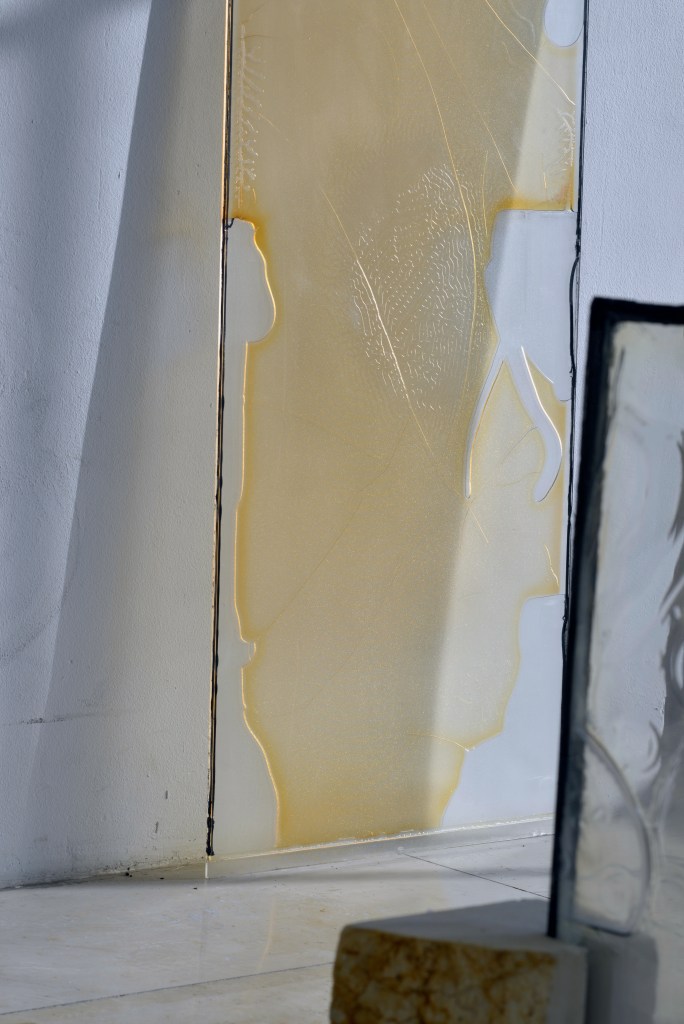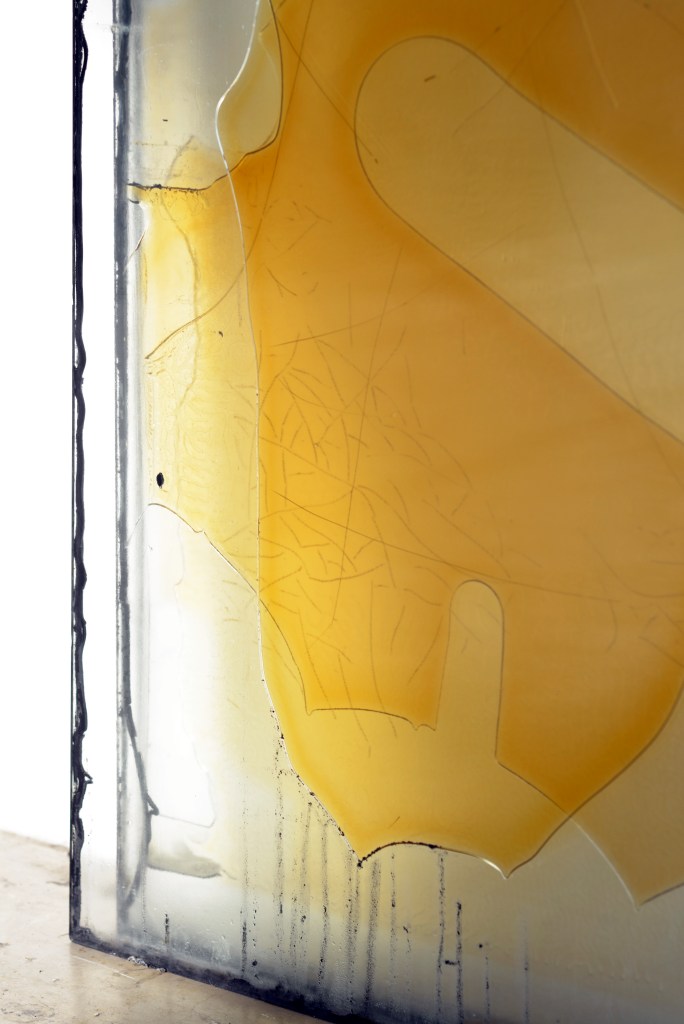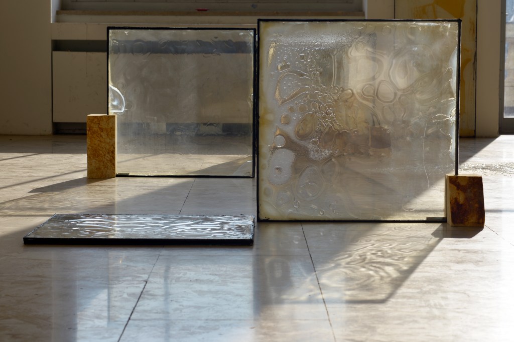 The glass panes were flashed with lamps from the screen-printing studio to amplify the degradation of the infrared and UV filters. The different layers of glass, fired in furnaces at temperatures ranging from 150 to 1,000 degrees Celsius, were separated to allow them to be opened up and displayed as sculptures on the floor.