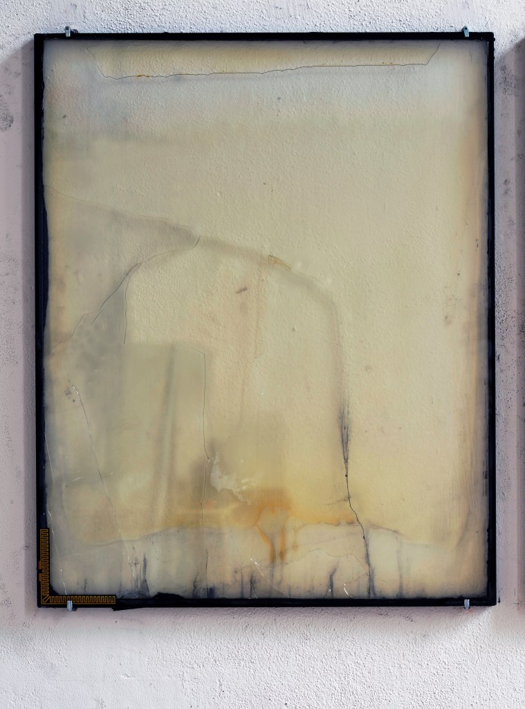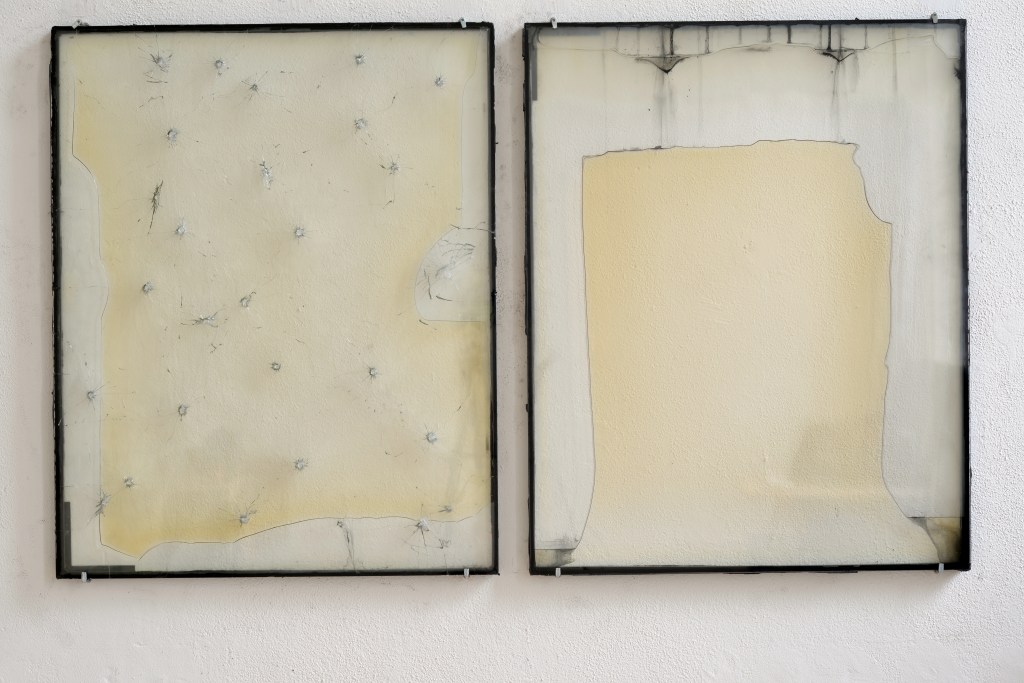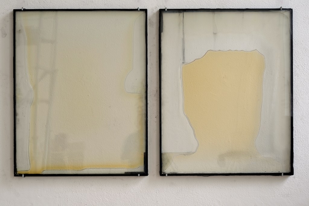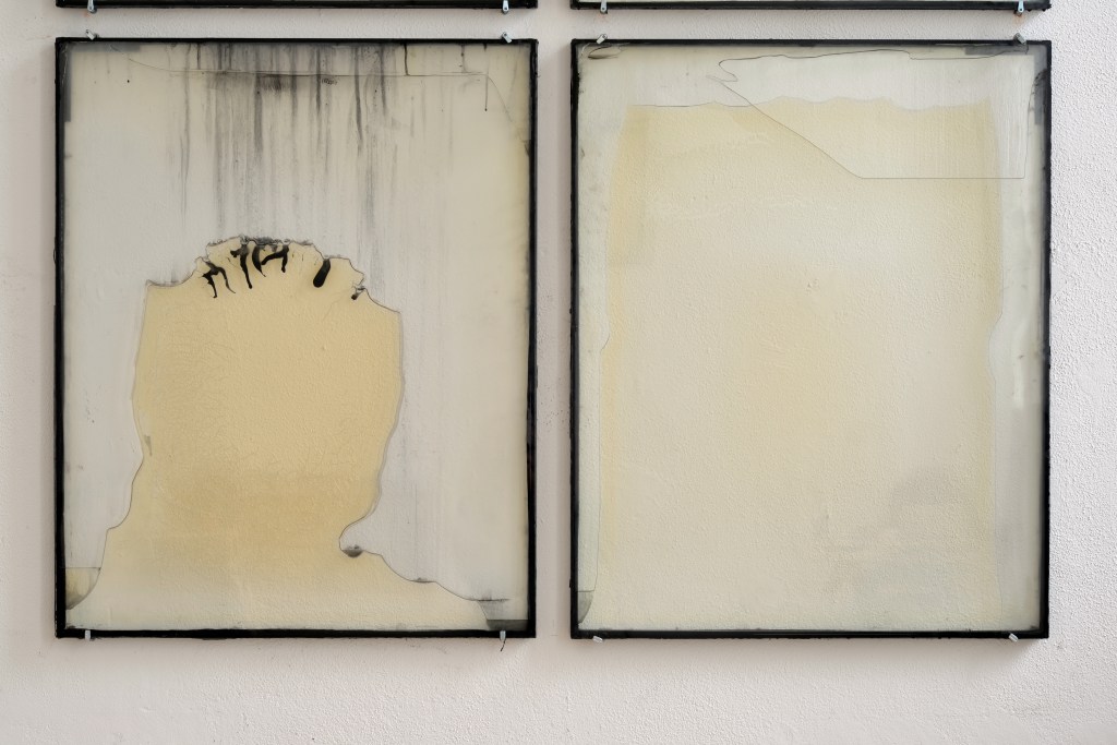 The glass panes from the Alte Pinakothek Museum, exchanged a few months earlier with those from the studio, were dismantled and hung. The drawings, which had blended into the landscape, were finally revealed by the walls of the working space, like paintings recently ‘deprived of a view’ on reality. Presented as ready-mades generated by natural light, the images contrast with the virtuoso representation of the “master paintings” that were first perceived through them.