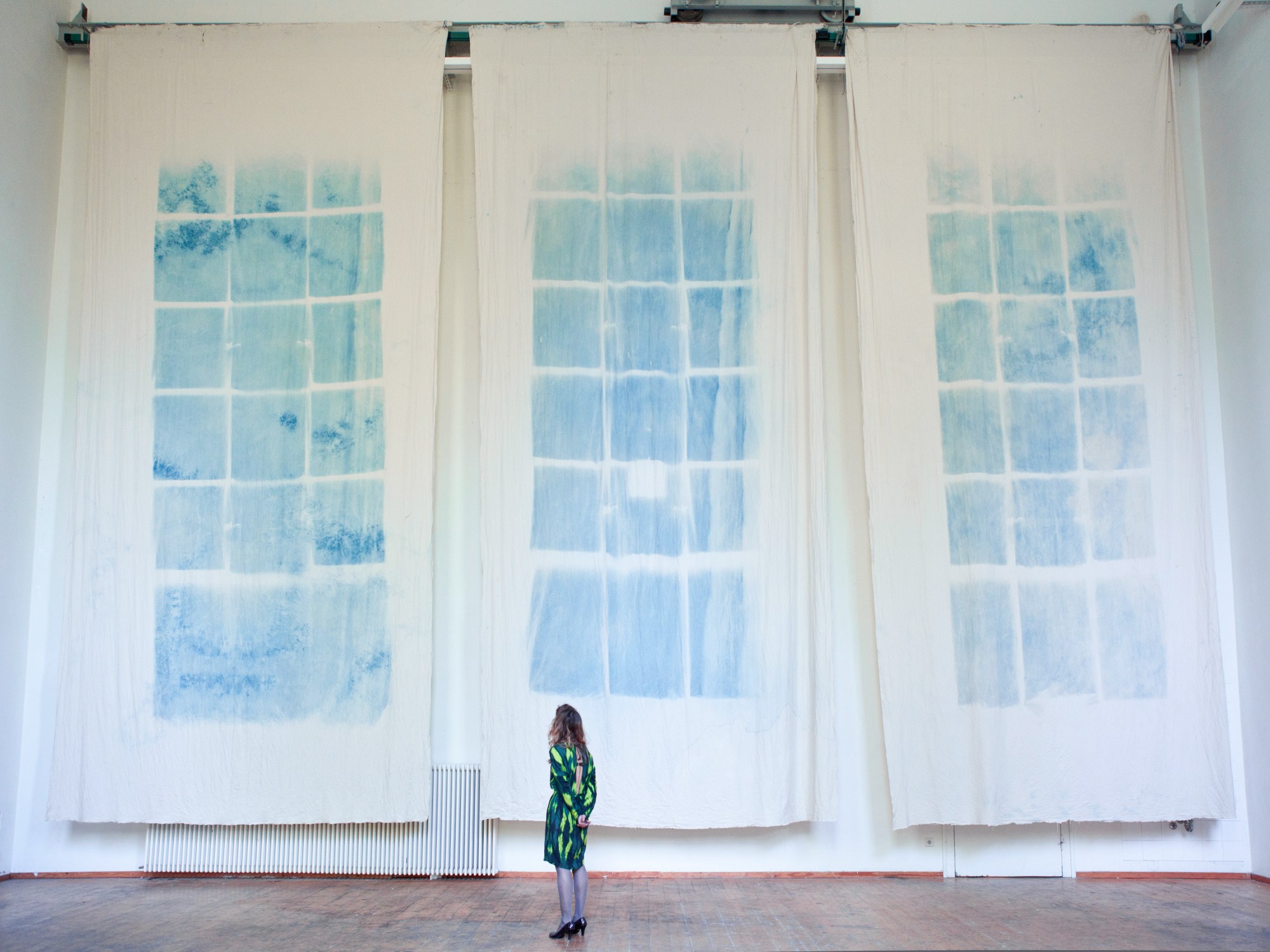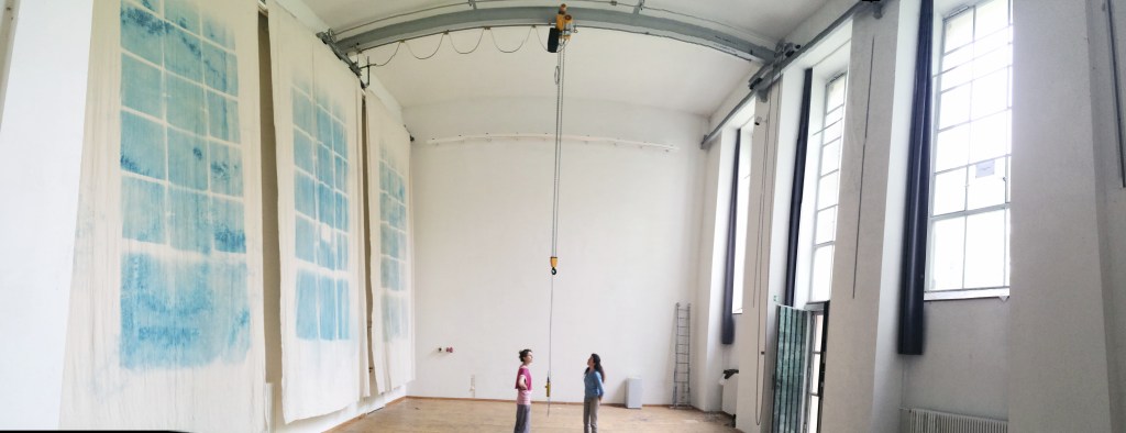 Great Hall of Domagkpark, Munich City Studios. Cyanotypes made in situ for the reopening of the studios after rehabilitation. Curator Katrin Dillkofer.