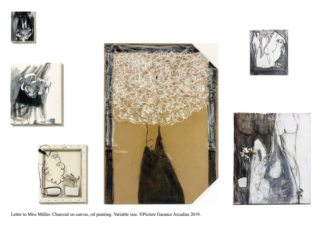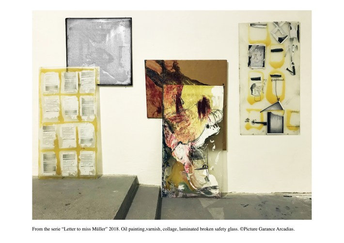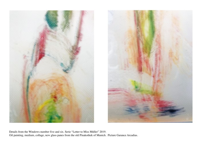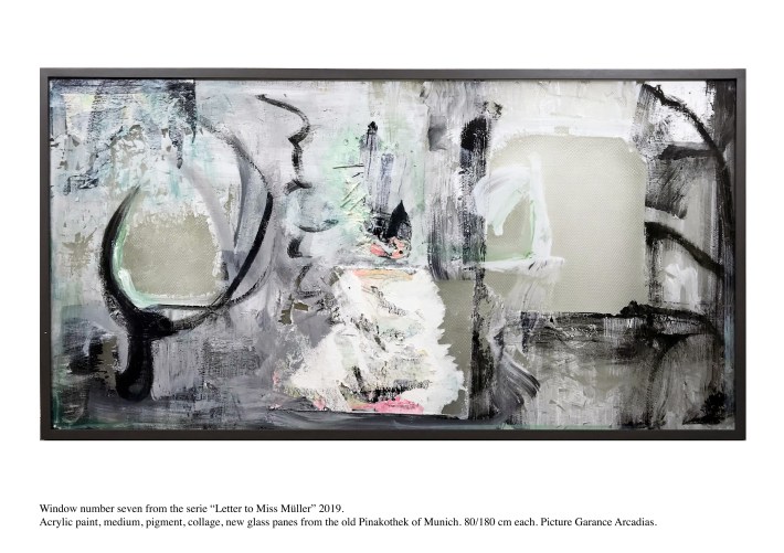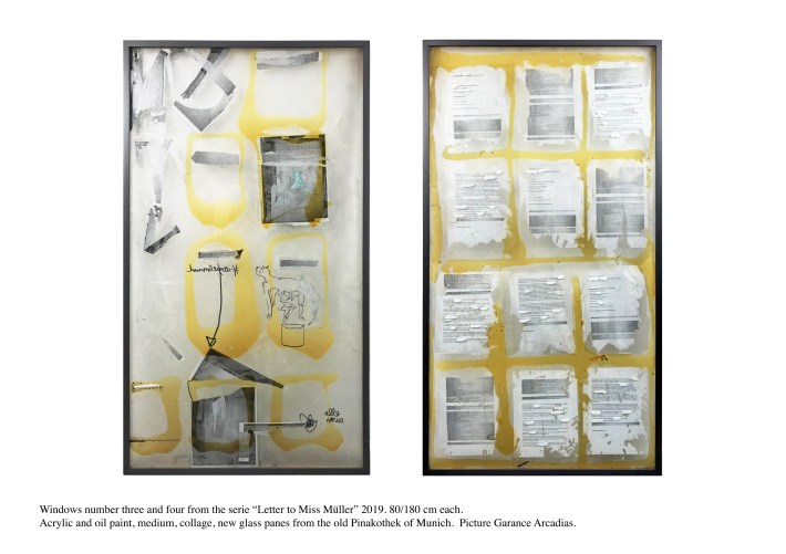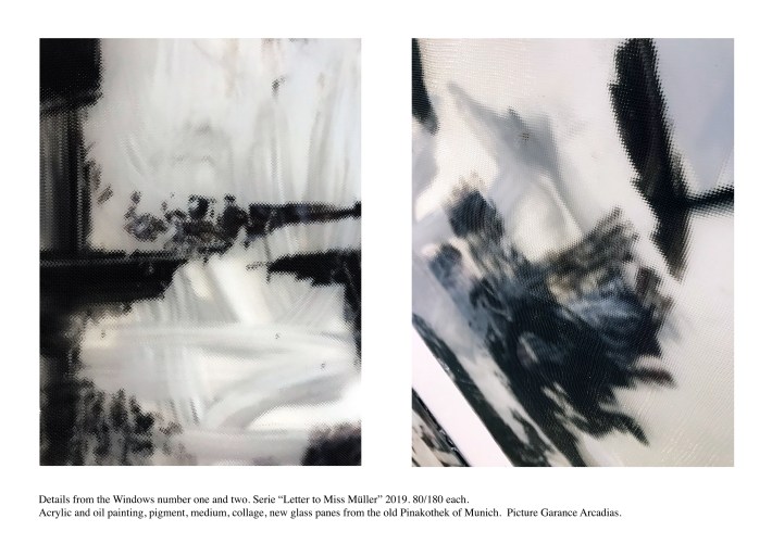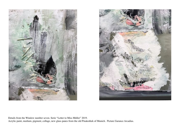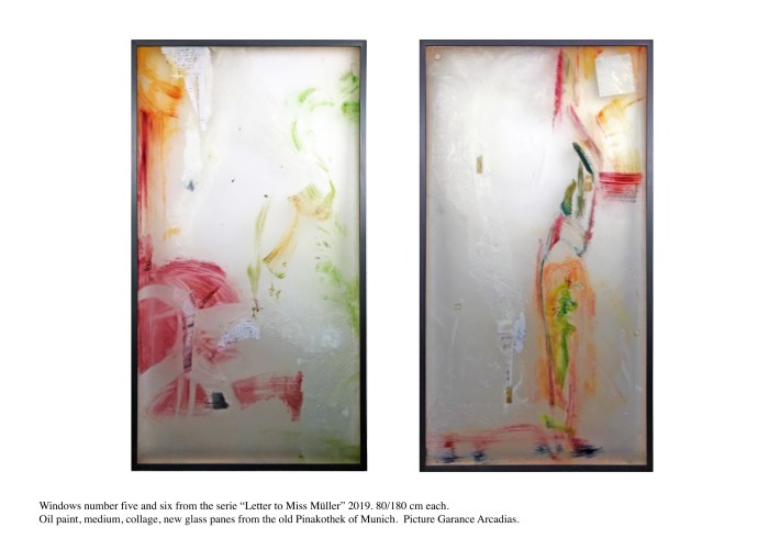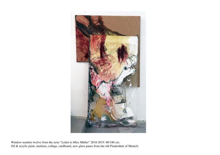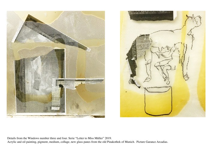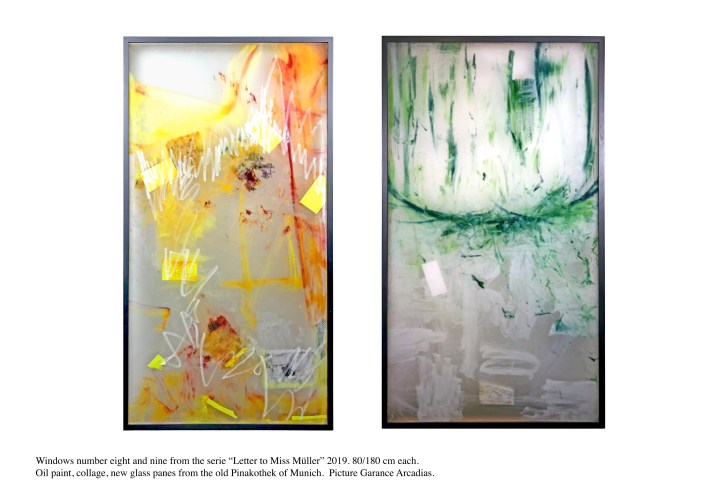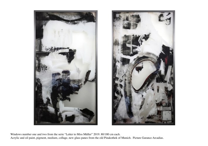 Lacquered wooden frame, Saint Gobain diffusion glass, acrylic paint, oil paint, collage, medium, laminated glass.