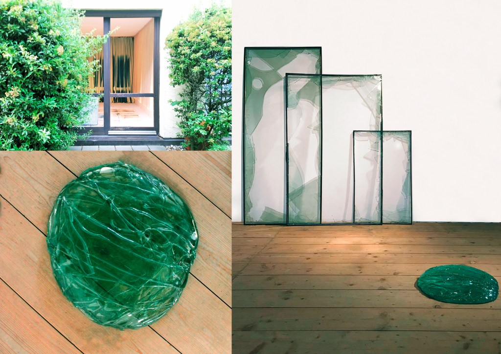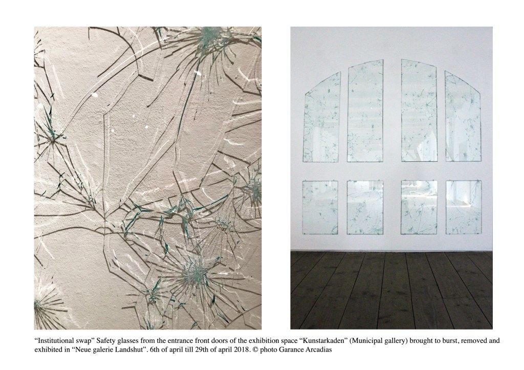 The glass panes of the front door of the “Kunstarkaden” Gallery have been hammered out. The filter between inside and outside was revealed by these cracks, which appear as patterns. The panes were dismantled after the exhibition and hung in the “Neue Galerie” in Landshut in 2018, in keeping with the proportions of the original French window.