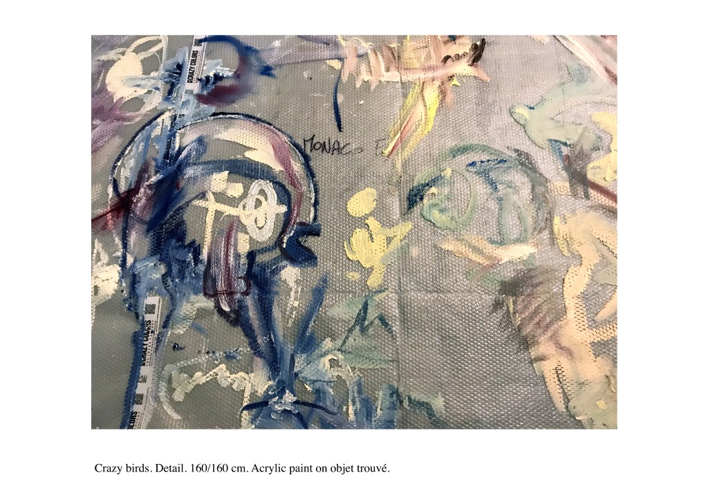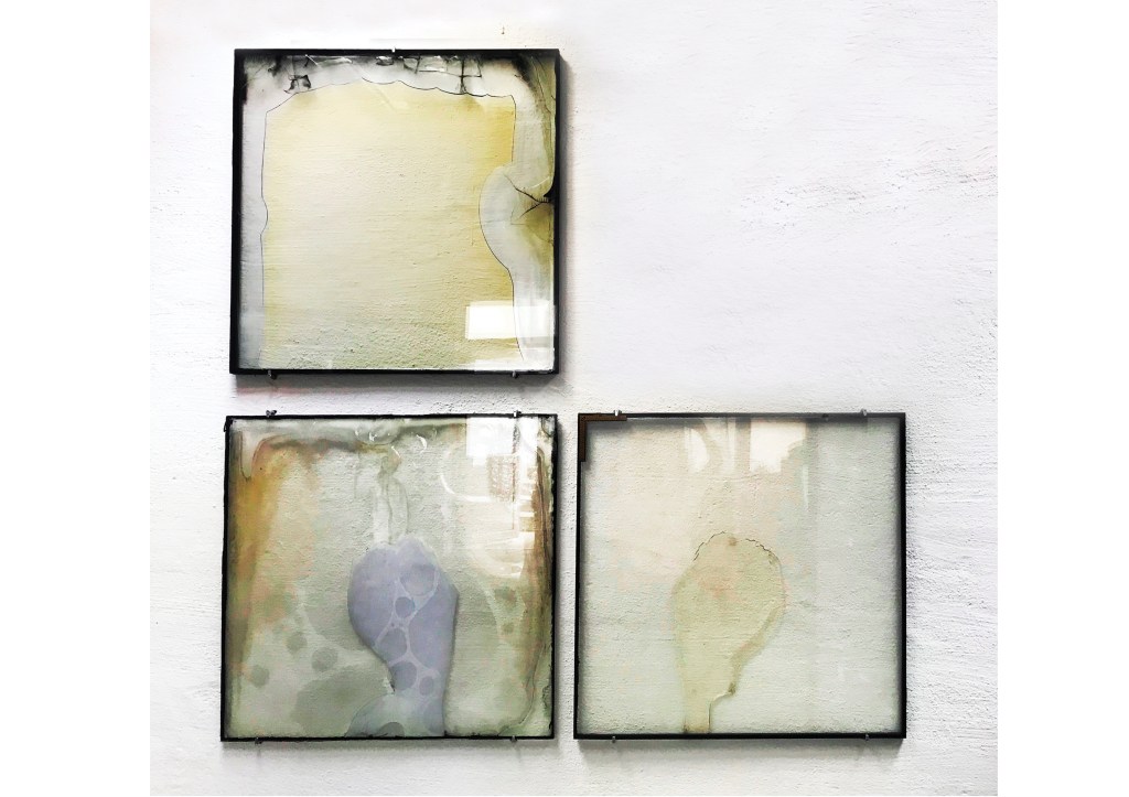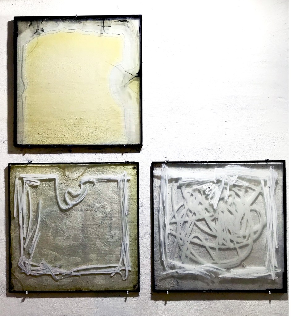 Size of each pane: 94/93 cm, safety glass, oil painting. 2019