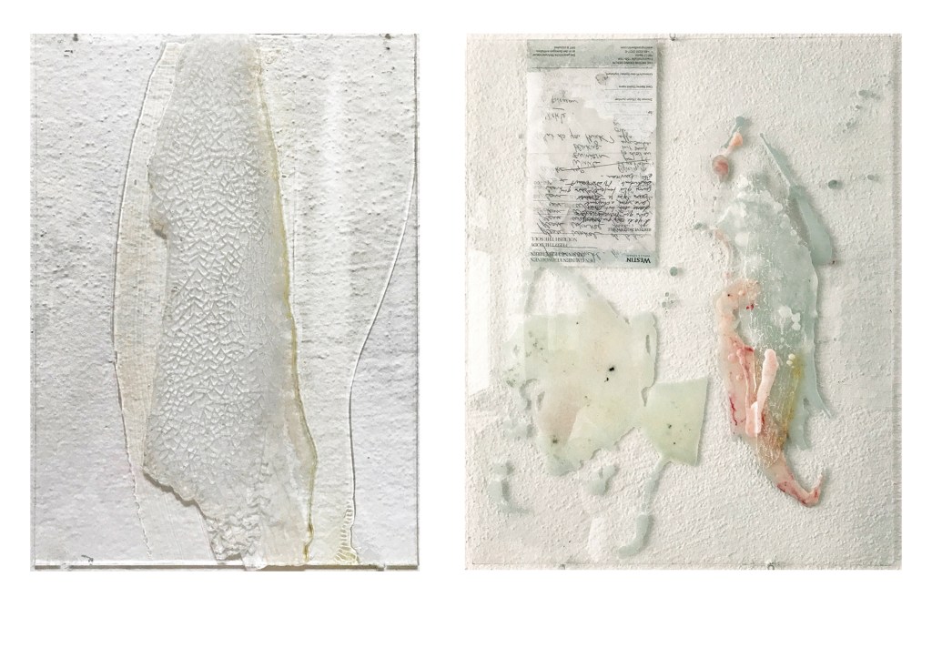 Letter to miss Müller Diptych 2019. Tempered glass broken and laminated on glass. Wax, medium, collage, varnish.