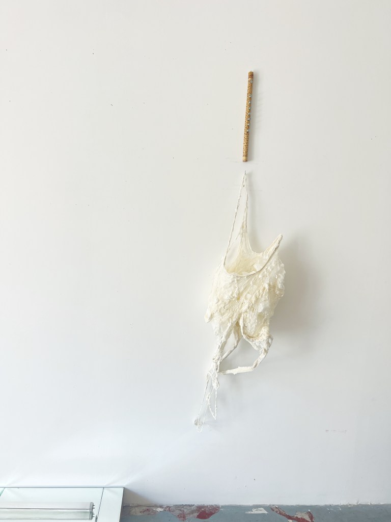 Gaslighting Frappat. “Becken” en construction.Installation.Vue d’atelier. Savon de Marseille et fibres de soie. Moulage sur nature. H 89 X l 39 X P27 cm