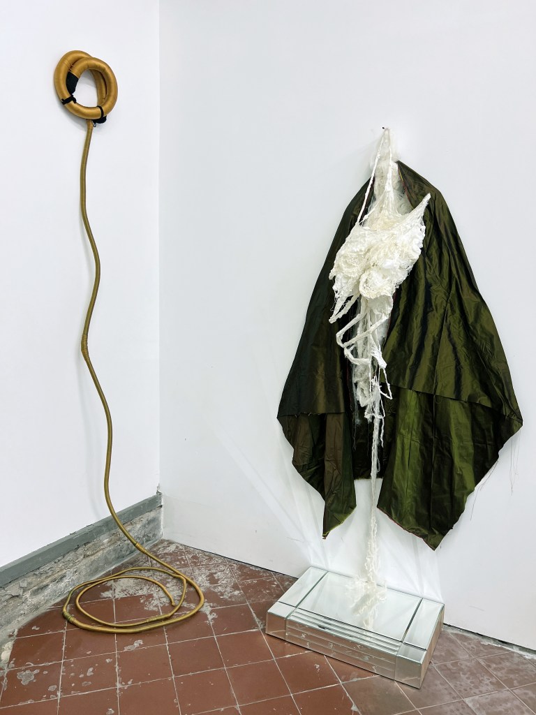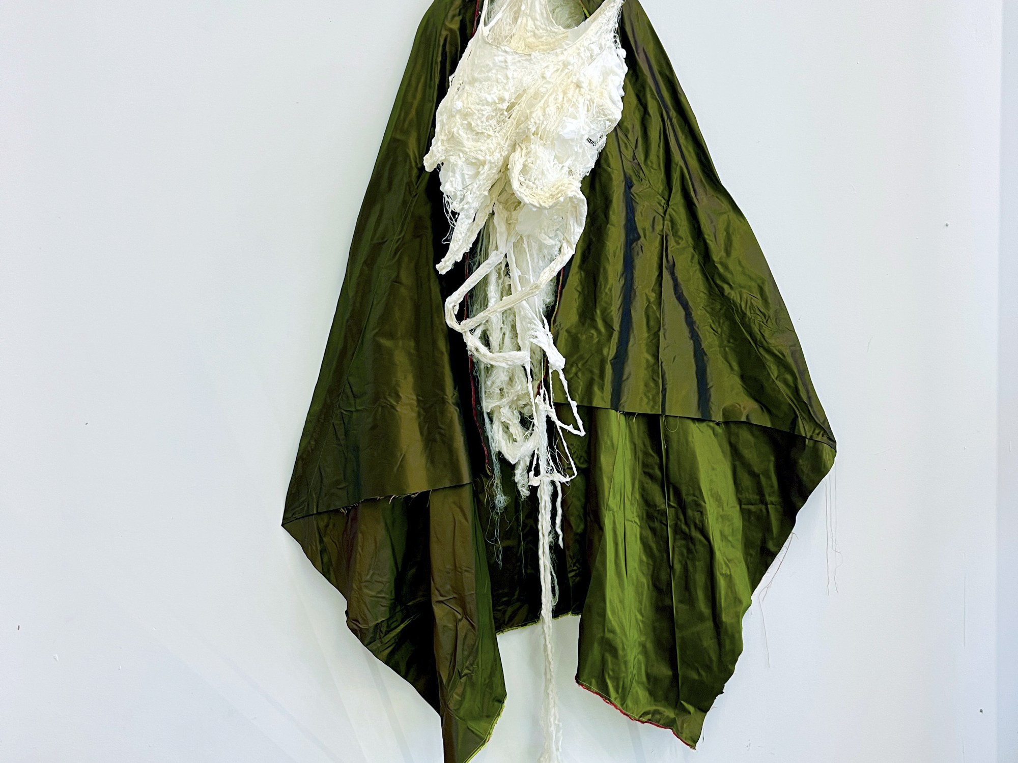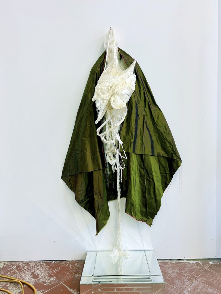 Becken – sans miroir caisse – H 170 X L 80 X P 27 cm. Moulage sur nature. Savon de Marseille. Fibres de soie. Textile en soie up-cyclée ( SA )
