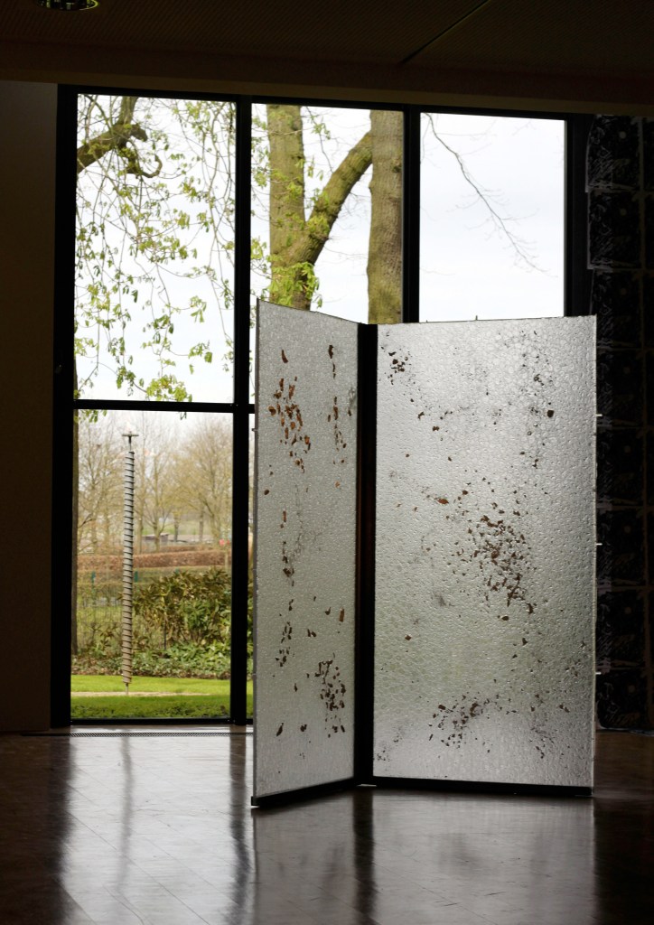 Ernsting Stiftung Museum, Allemagne 2015. Mausolée (Vanitas Glas). Os vitrifiés et cendres d’os, fusing sur grands verres plats (15 mm) . H 200 X L 90 X P 90 cm