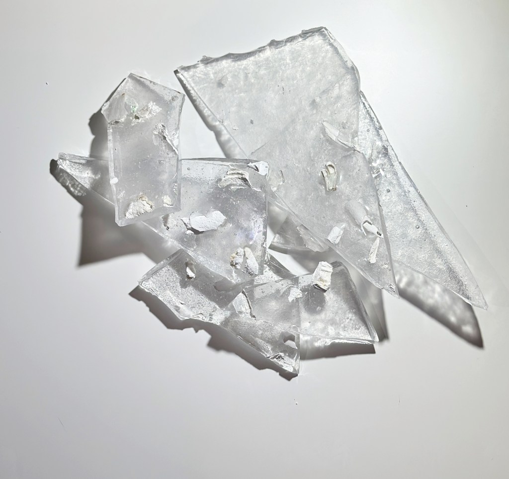 Galerie La Traverse, Marseille.2025. Éclats du Mausolée brisé. Os vitrifiés et cendres d’os sur verres plats (15 mm) . H 1, 5 X l 50 X L 50 cm